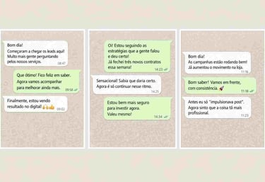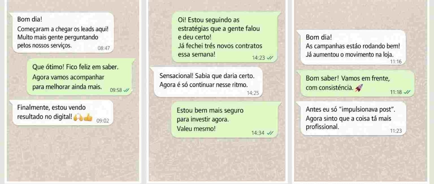 Essas mensagens são de empresários que tinham medo de investir em anúncios e já tinham tentado sem resultado. O que mudou não foi sorte, foi estratégia, clareza e acompanhamento. Sem promessas milagrosas. Apenas o digital funcionando do jeito certo.